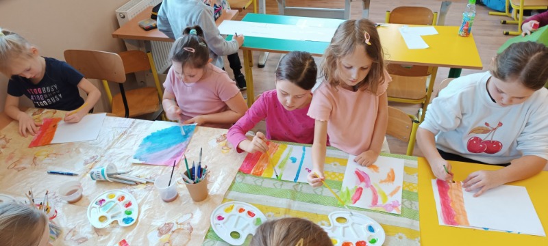 a mianowicie bajki i baśnie. Odbywały się rozmowy kierowane nt. „Dlaczego warto czytać baśnie?”, „Co to jest bajka?”, „Różnica między bajką a baśnią”. Wspólnie czytaliśmy wybrane bajki i baśnie , rozmawialiśmy również na temat morałów w nich zawartych. Ocenialiśmy zachowania bohaterów. Nie mogło zabraknąć również mini quizu w którym zadaniem dzieci było dobrać nazwę postaci do tytułu bajki lub baśni. W naszym zakątku świetlicowym dzieci stworzyły piękne prace, które stanowią ozdobę naszej świetlicowej gazetki.