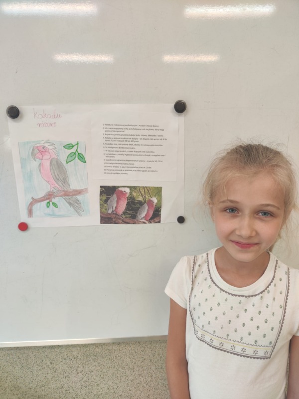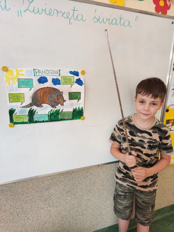 Mali tropiciele z klasy drugiej podczas zajęć lekcyjnych wspólnie poznawali zwierzęta z różnych kontynentów świata: ich wygląd, zachowanie, sposób życia. Korzystali z map, atlasów, encyklopedii przyrodniczych, albumów, filmów edukacyjnych, prezentacji oraz innych dostępnych źródeł wiedzy. Wykonali prace plastyczne o zwierzętach Afryki. Uczniowie przygotowali również plakaty i prezentacje wybranego przez siebie zwierzątka, które w niezwykle ciekawy sposób zaprezentowali podczas zajęć.