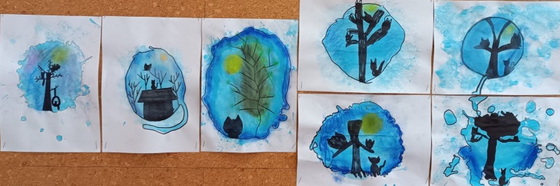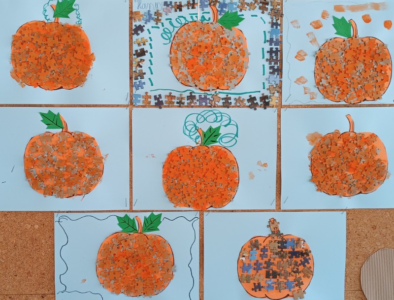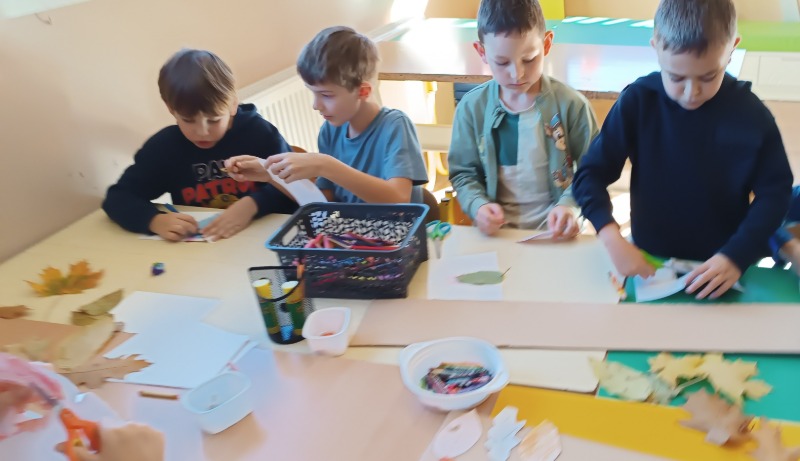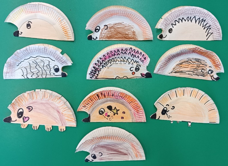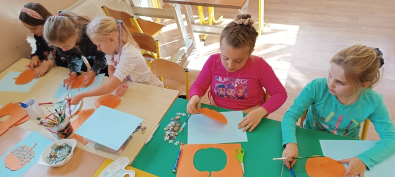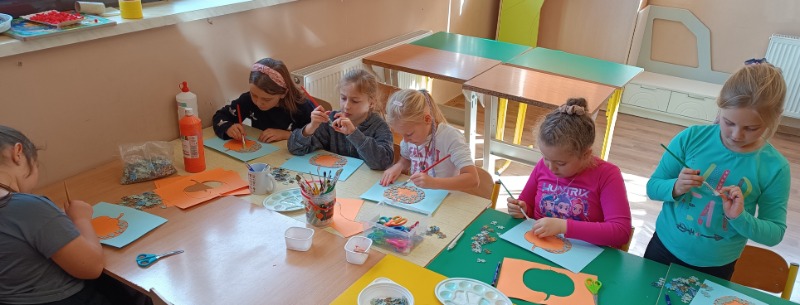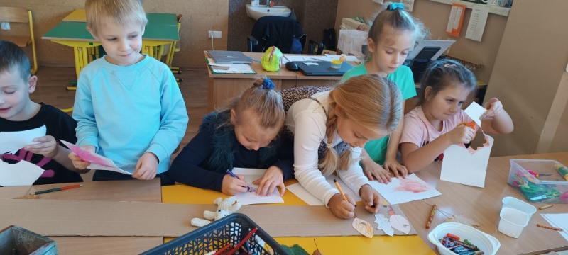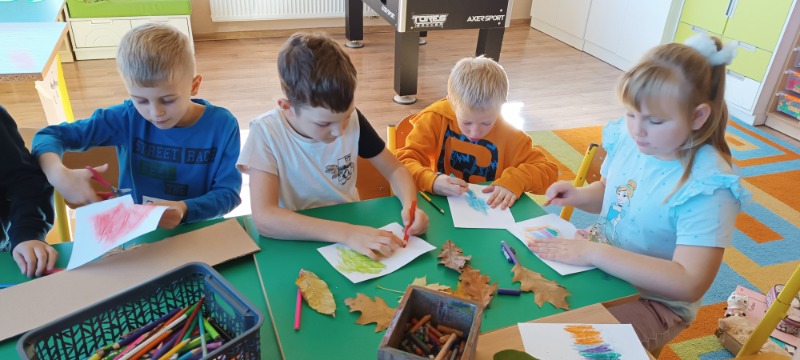 Jesień zainspirowała nas do stworzenia wyjątkowych i pełnych kolorów prac plastycznych. W ramach cyklu „Jesienny misz-masz” dzieci miały okazję wypróbować różnorodne techniki artystyczne oraz wykorzystać nietypowe materiały. Powstały piękne odbijanki z liści, które zachwycają bogactwem kształtów i barw. Z papierowych talerzyków wyczarowaliśmy urocze jeże, a z puzzli powstały kreatywne, przestrzenne dynie. Dzieci eksperymentowały również z kredkami akwarelowymi, odkrywając, jak za pomocą wody można zmienić rysunek w malarski obraz. Dużo radości przyniosło także malowanie na plamie, które pobudzało wyobraźnię i pozwalało dostrzec w przypadkowych kształtach niezwykłe formy. Zajęcia były doskonałą okazją do rozwijania kreatywności, sprawności manualnej oraz odwagi w twórczym działaniu.