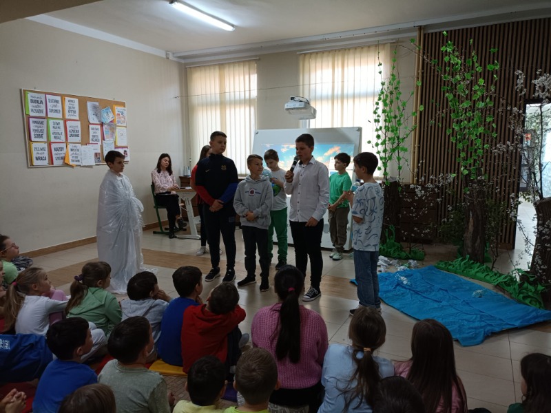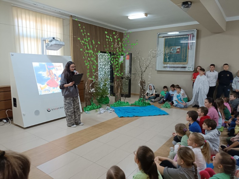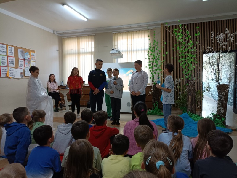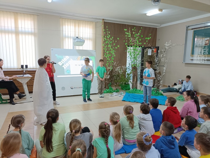 Z okazji Dnia Ziemi uczniowie klasy 4 przygotowali przedstawienie pt. „Cztery żywioły w obronie Ziemi”. W swoim występie przypomnieli, że kiedyś nasza planeta funkcjonowała w pełnej równowadze – żywioły współpracowały ze sobą, a świat oddychał spokojnie i harmonijnie. Niestety, człowiek zakłócił ten porządek, ingerując w naturę i niszcząc środowisko. Na szczęście w przedstawieniu nie zabrakło nadziei – człowiek zrozumiał swój błąd i obiecał poprawę, bo przecież Ziemia jest tylko jedna.